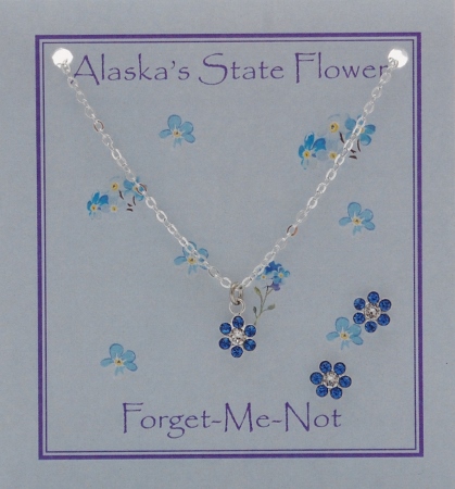 Sapphire Swarovski crystals are the petals of our sterling silver Forget Me Not Earrings and Pendant. Sterling silver post earrings. The sterling pendant hangs from a 16 inch sterling silver ball chain. The history of Alaska's state flower is printed on the back of the stand up card.