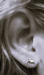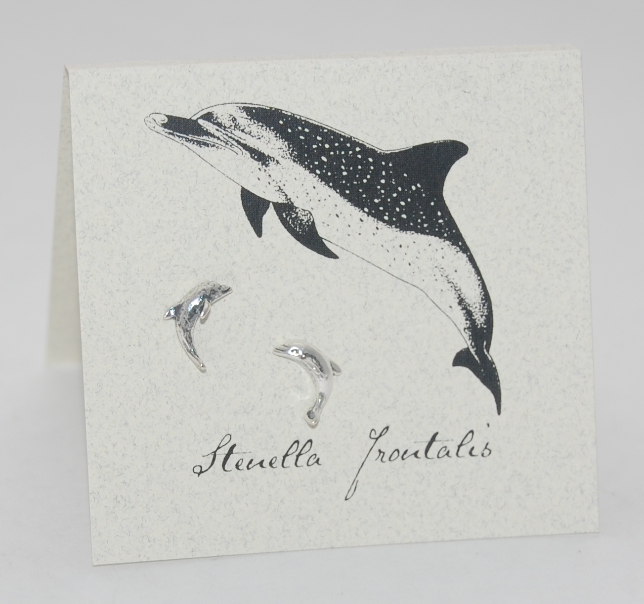 Solid sterling silver dolphin post earrings are mounted on our Natural History card. An educational message about dolphins is printed on the card's back.